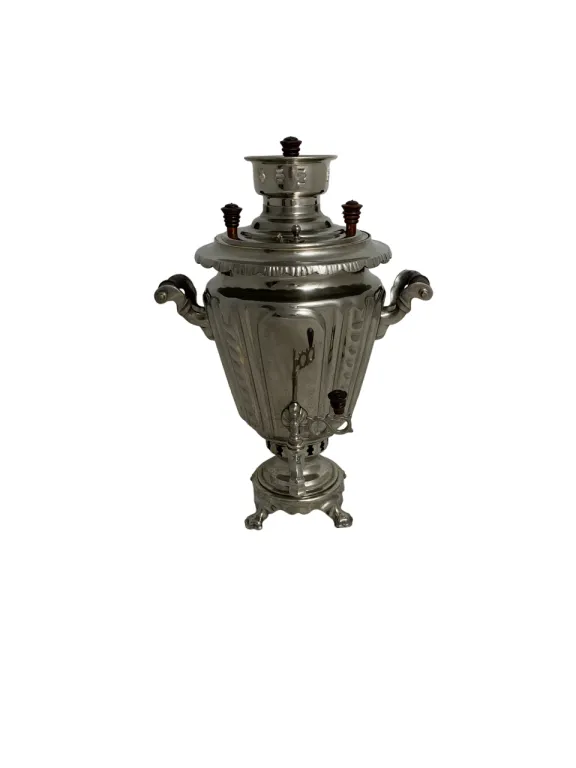 Цена на товар может измениться после поступления товара. Точную цену уточняйте у нашего менеджера. Телефон: 8 (812) 336-25-25Самовар Рюмка с косичками, 4,5 литра, завод Штамп Тула 70-е годы ХХ века, восстановлен, никель, белый, труба 66 мм