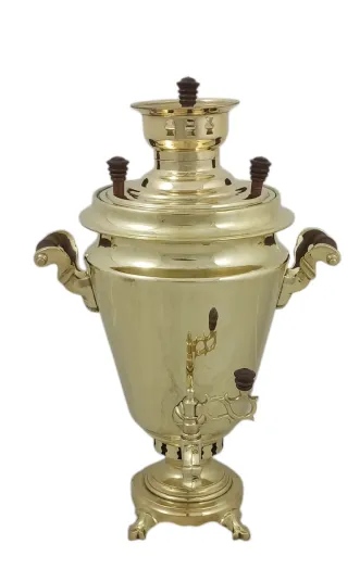 Цена на товар может измениться после поступления товара. Точную цену уточняйте у нашего менеджера. Телефон: 8 (812) 336-25-25Самовар Рюмка, гладкая, 5 литров, завод Штамп Тула, 50-е годы ХХ века, восстановлен, латунь, желтый, труба 66 мм