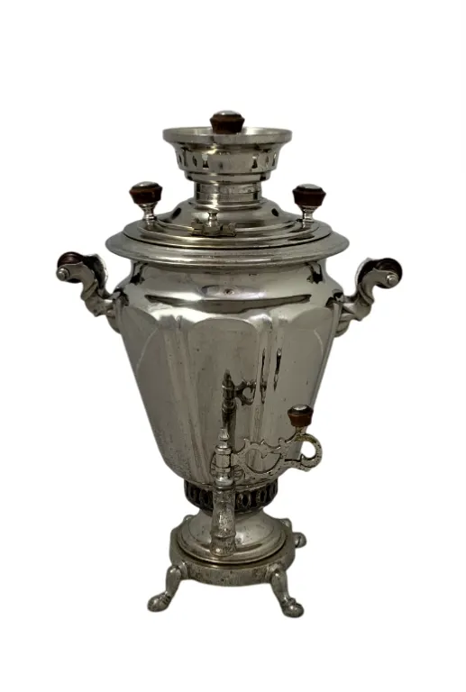Цена на товар может измениться после поступления товара. Точную цену уточняйте у нашего менеджера. Телефон: 8 (812) 336-25-25Самовар Рюмка, дольная, 4 литра, не клейменая, восстановлен. 20-е годы ХХ века, никель, белый, труба 62 мм