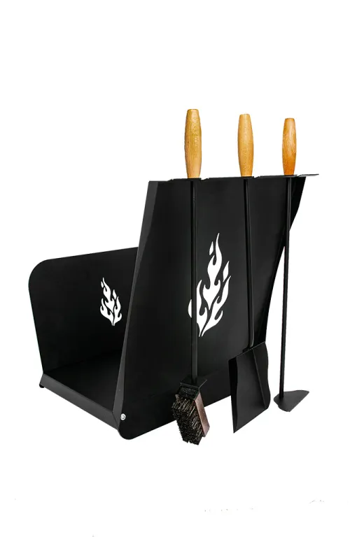Напольный набор с отсеком для дров. Состоит из трёх предметов: щётки для очистки очага, совка и кочерги. Ручка каждого аксессуара выполнена из ценных пород дерева.