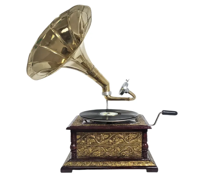 Граммофон механический с трубой в рабочем состоянии. Современный. Деревянный квадратный корпус из темного дерева с латунной трубой.
