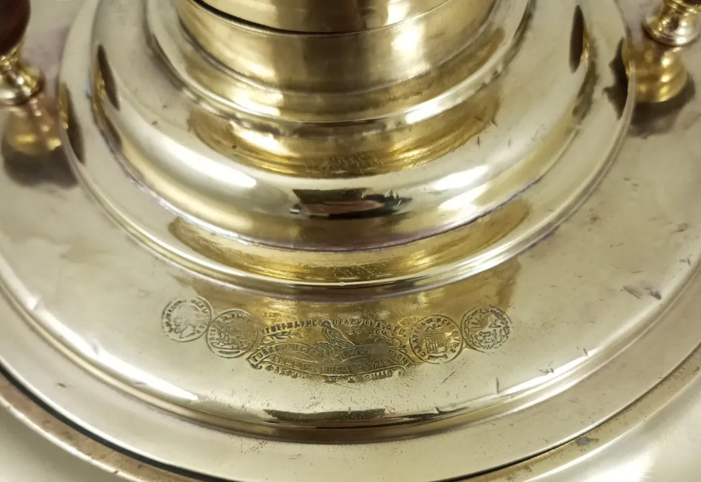 Цена на товар может измениться после поступления товара. Точную цену уточняйте у нашего менеджера. Телефон: 8 (812) 336-25-25Самовар Рюмка гладкая, 9 литров, Товарищество Торгового Дома братьев Шемариных въ Туле, конец 19 начало 20 века, восстановлен, латунь, желтый. труба 72 мм