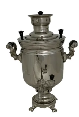 Цена на товар может измениться после поступления товара. Точную цену уточняйте у нашего менеджера. Телефон: 8 (812) 336-25-25Самовар Банка, гладкая, 5 литров, завод Штамп Тула, 60-е годы ХХ века, восстановлен, никель, белый, труба 66 мм